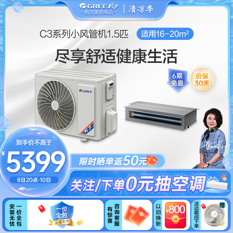 券 50元销量0格力客厅卧室中央空调风管机家用一拖一3匹2二级能效变频冷暖C3