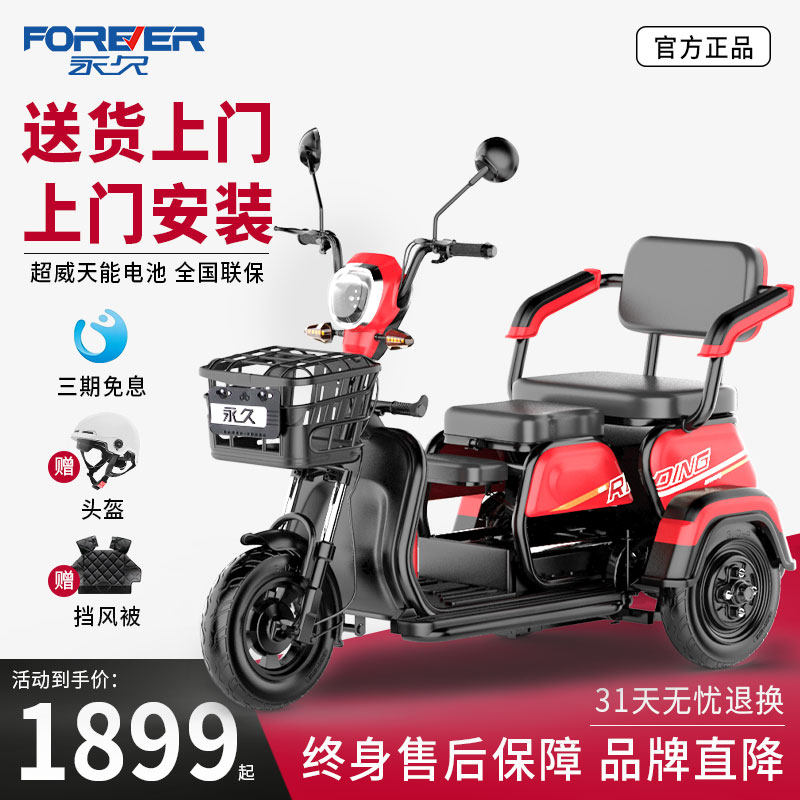 永久电动三轮车家用小型老人代步车老年电瓶车接孩子带棚新款休闲