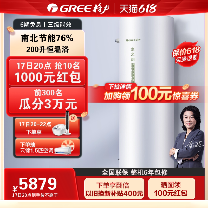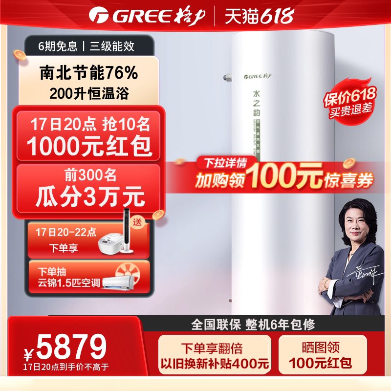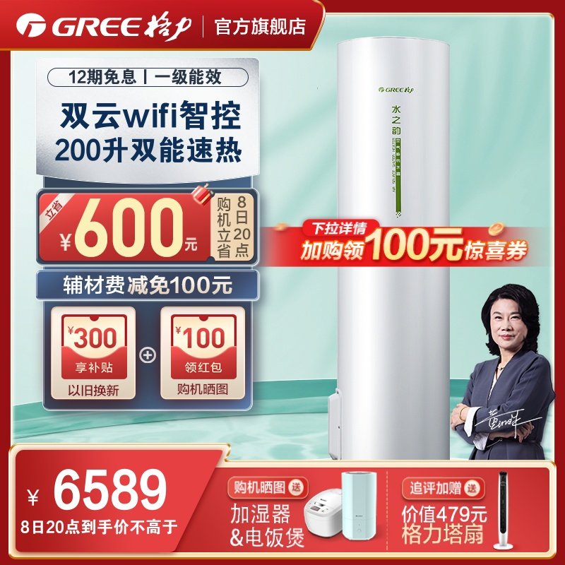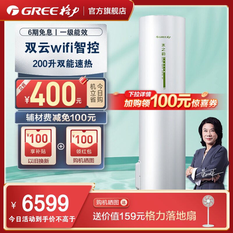 券 100元销量0Gree/格力空气能电热水器200L空气源热泵带电辅家用节能水之韵