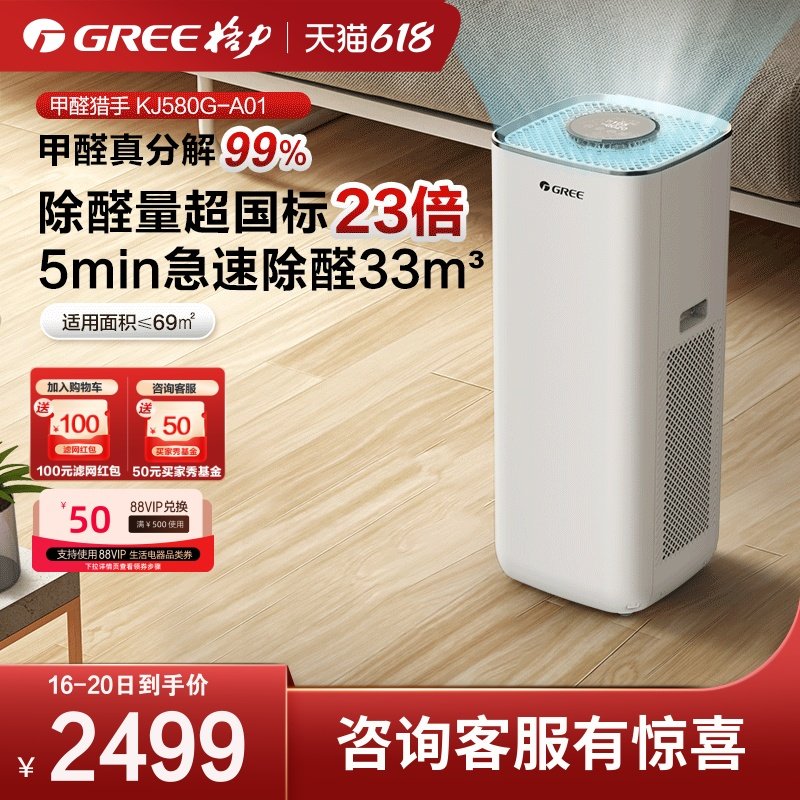 券 100元销量77GREE/格力空气净化器甲醛猎手除菌去除异味吸烟家用分解机KJ580G