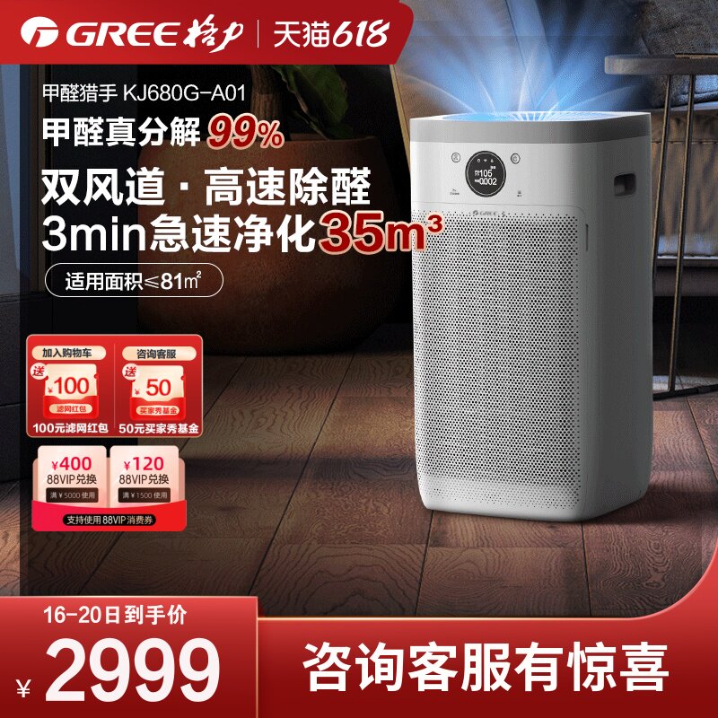 券 100元销量300GREE格力甲醛猎手分解甲醛除菌空气净化器大风量去除家用KJ680G