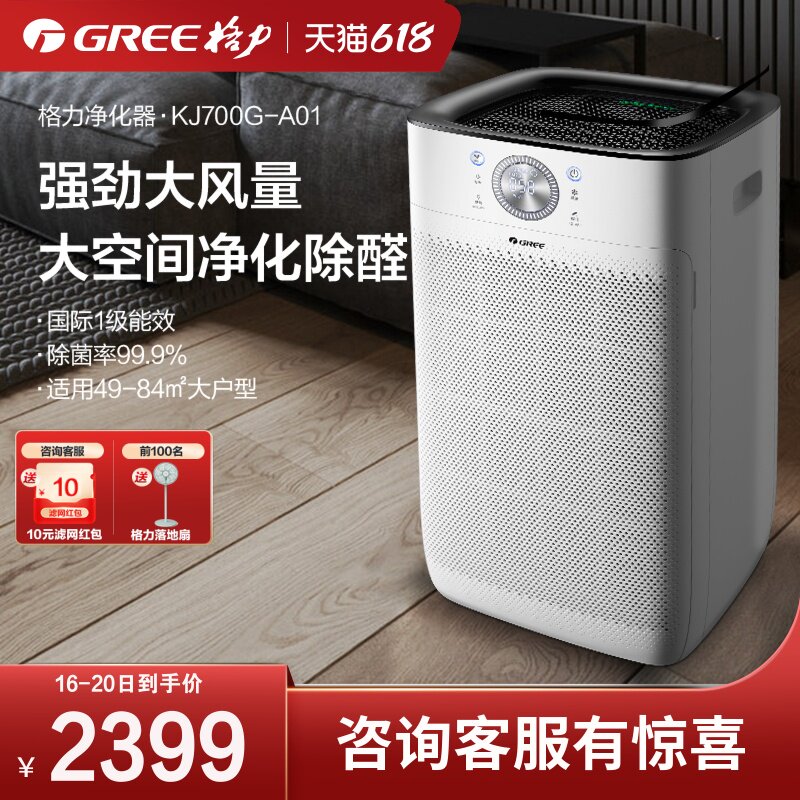 券 100元销量86格力空气净化器家用办公室大面积除醛除烟除菌室内净化机KJ700G