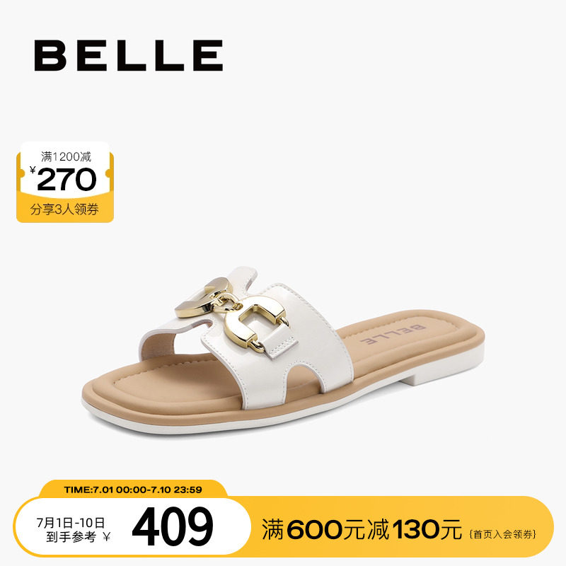 券 120元销量900百丽链扣一字拖女2023夏季新款外穿拖鞋女鞋商场真皮凉拖Z9A1DBT3