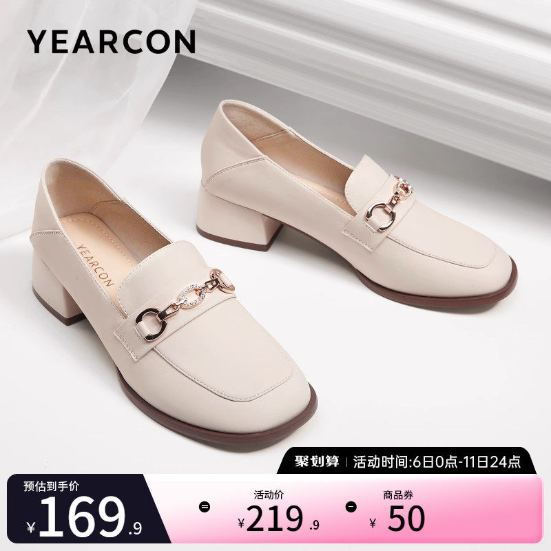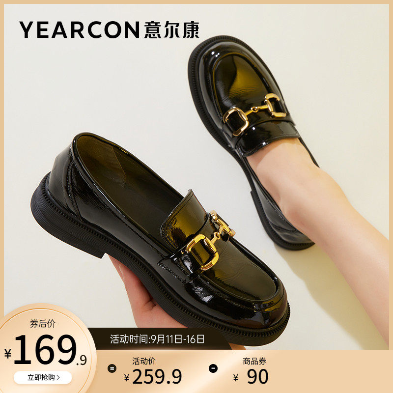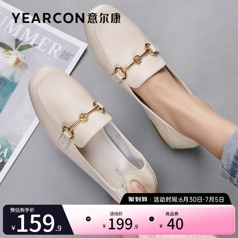 券 120元销量100意尔康女鞋2022新款女士浅口软皮单鞋粗跟乐福鞋英伦风小皮鞋薄款