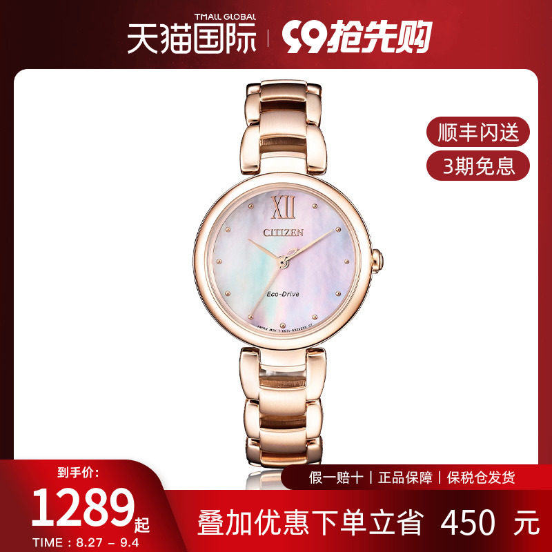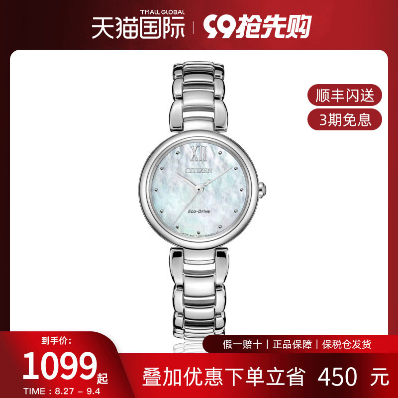 券 400元销量10Citizen西铁城正品光动能女表贝母表盘钢带手表EM0533 生日礼物