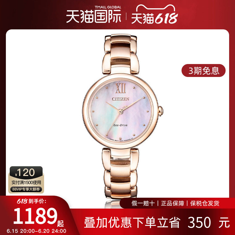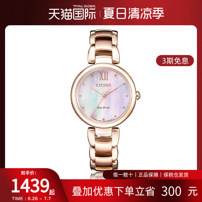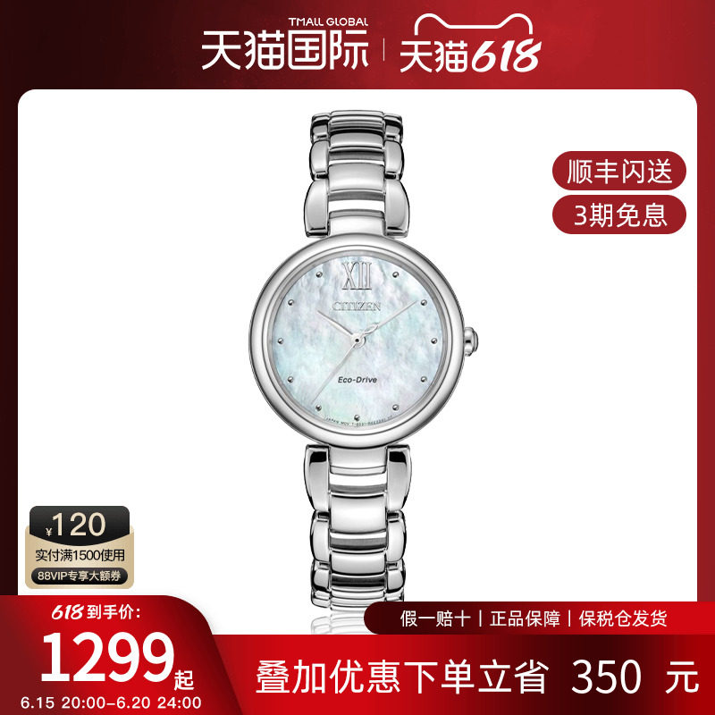 券 150元销量10【保价618】Citizen西铁城正品光动能女表贝母表盘钢带手表EM0533