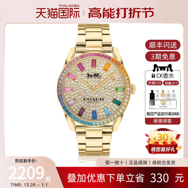 券 100元销量5COACH蔻驰女生手表闪耀钢带奢华七彩满钻表欧美腕表女友新年礼物