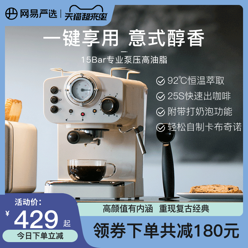 券 180元销量100网易严选意式咖啡机家用小型全半自动浓缩复古蒸汽式美萃取打奶泡
