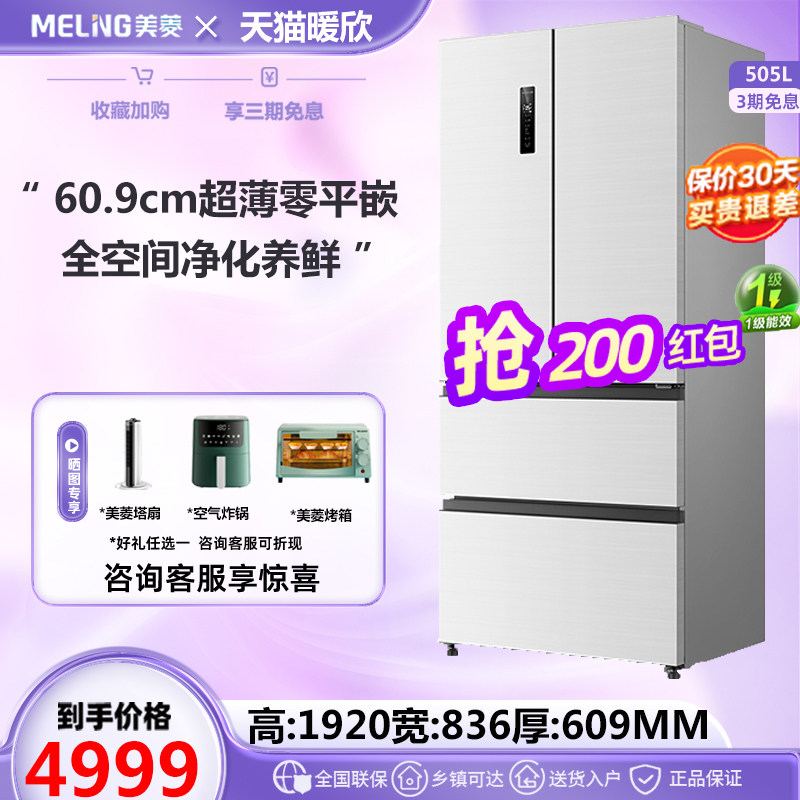 美菱超薄嵌入505L升法式对开多门白色家用大容量冰箱嵌入底部散热