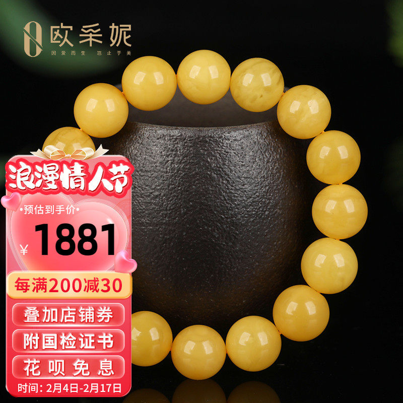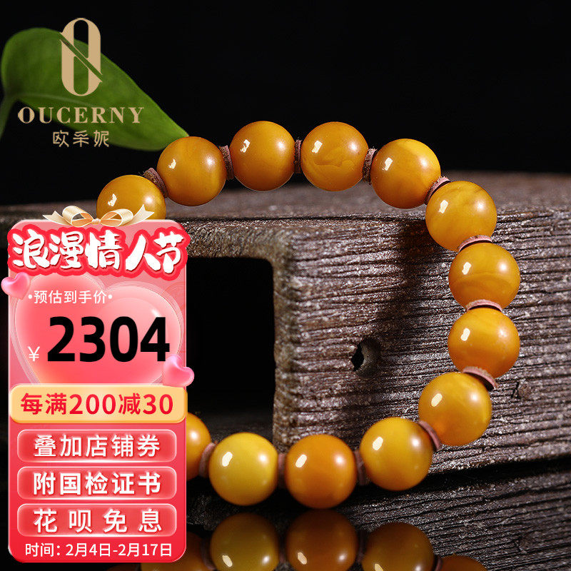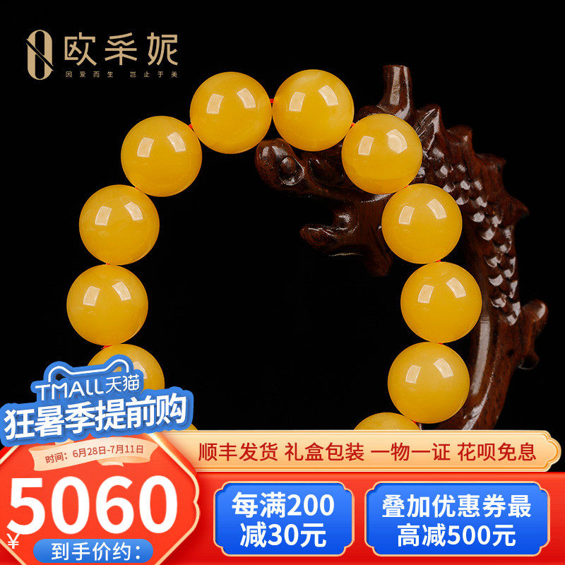 券 600元销量0欧采妮天然蜜蜡手串鸡油黄满蜜无优化妖孽级圆珠琥珀手链男女士款