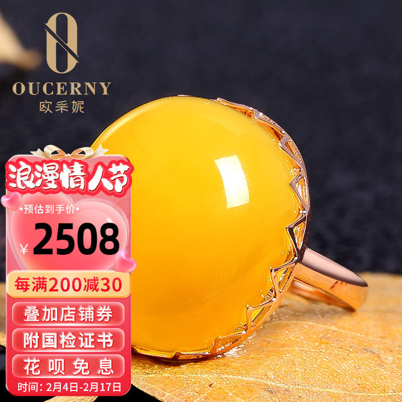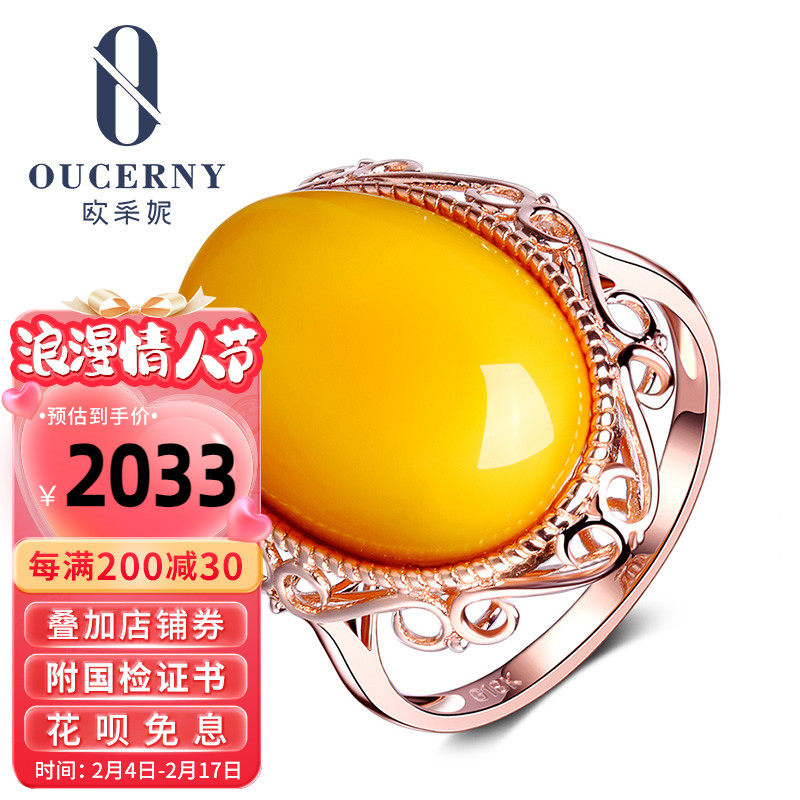 券 200元销量0欧采妮 天然波罗的海琥珀18K玫瑰金镶嵌戒指 鸡蛋黄蜜蜡戒指女款