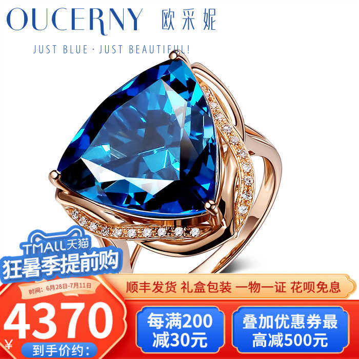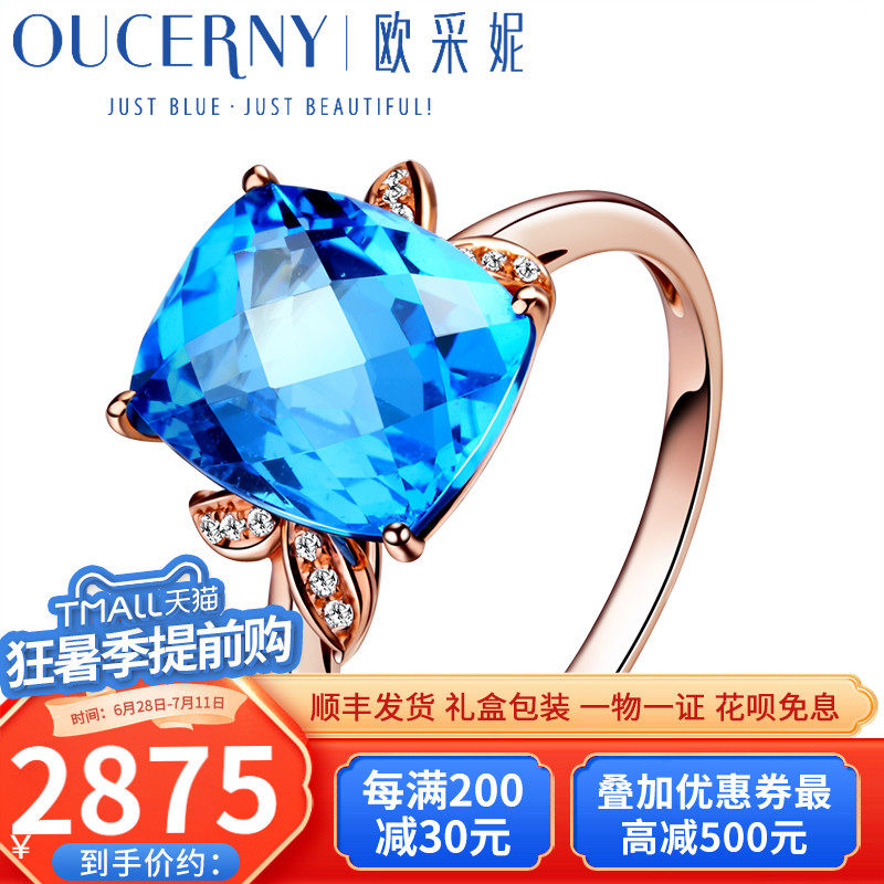 券 400元销量0欧采妮珠宝 13克拉伦敦蓝托帕石戒指 彩色宝石钻石女戒18k金彩宝