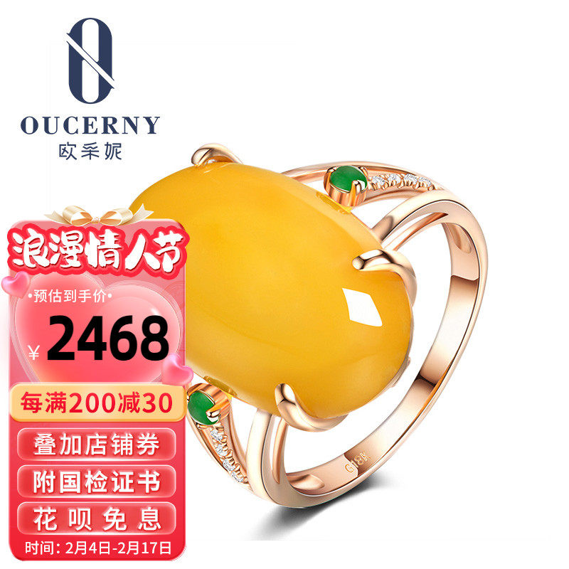 券 200元销量0欧采妮 蜜蜡戒指女士18k金镶嵌天然正品鸡油黄琥珀戒指男士款手饰