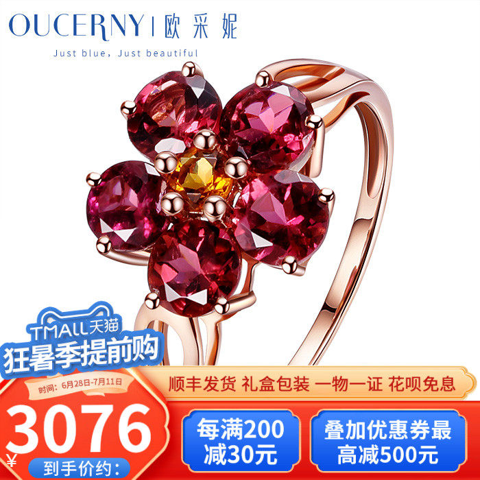 券 200元销量0欧采妮珠宝 红碧玺花瓣戒指 18K玫瑰金碧玺女戒镶钻石首饰品