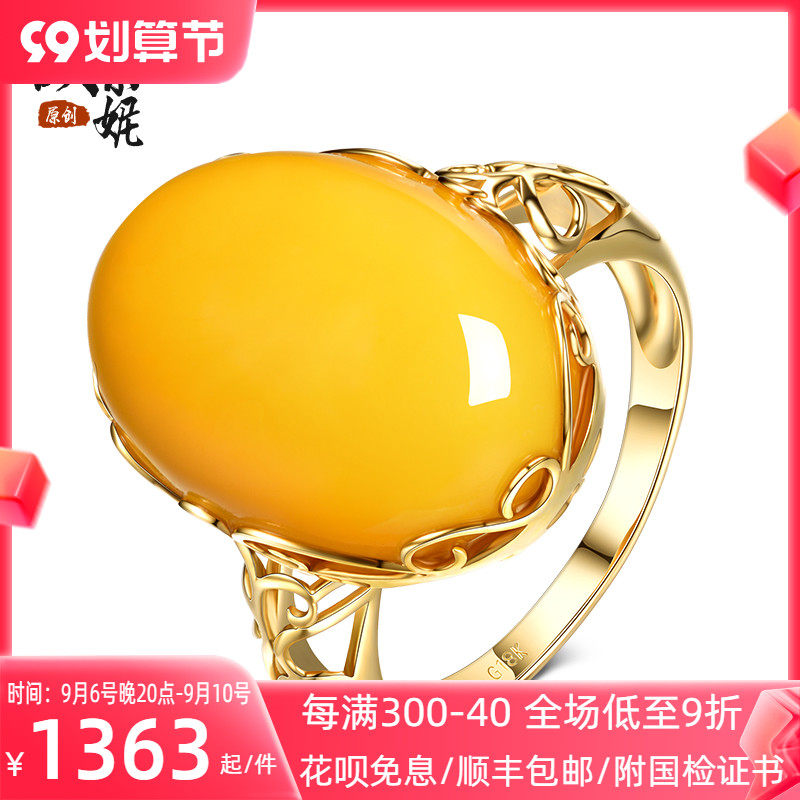 券 300元销量0欧采妮 18K金镶嵌天然琥珀蜜蜡 琥珀戒指 蜜蜡戒指 女 鸡油黄满蜜