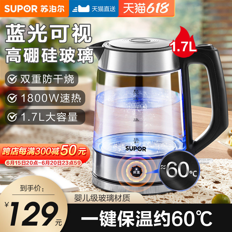 券 20元销量800苏泊尔烧水壶玻璃电热水壶自动家用恒温保温一体开水壶2022新款