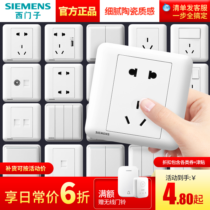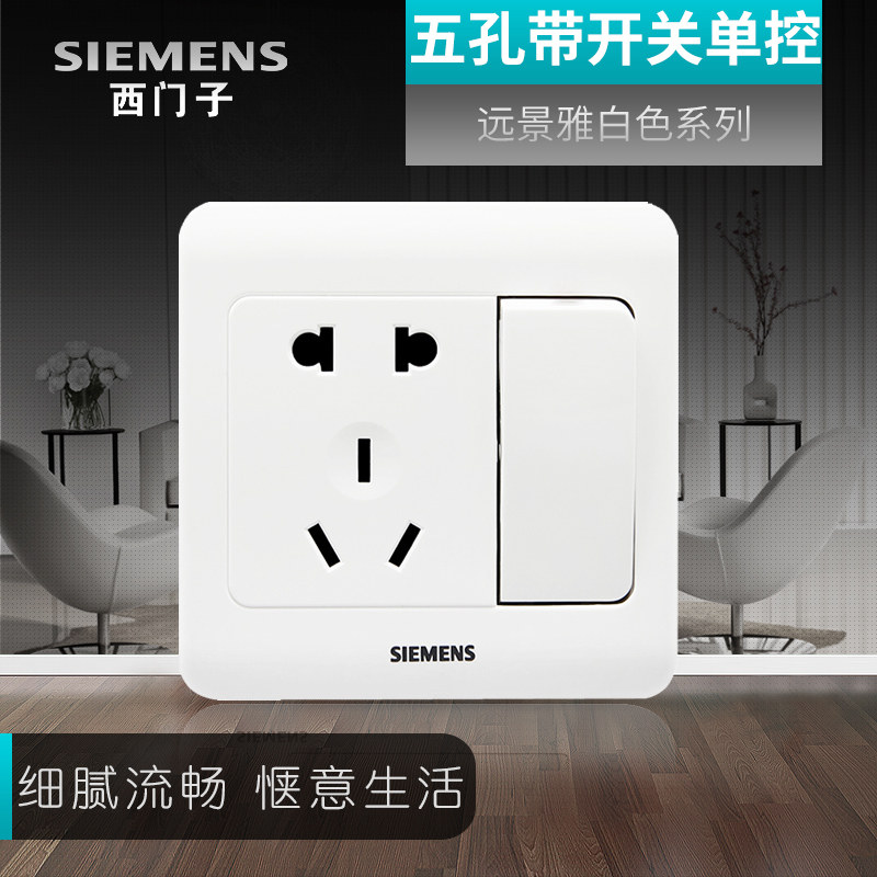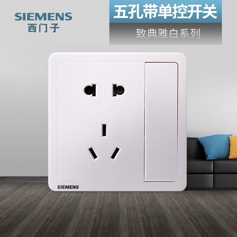 券 5元销量8西门子一开五孔插座带开关面板 远景雅白色三孔墙壁86型暗装家用