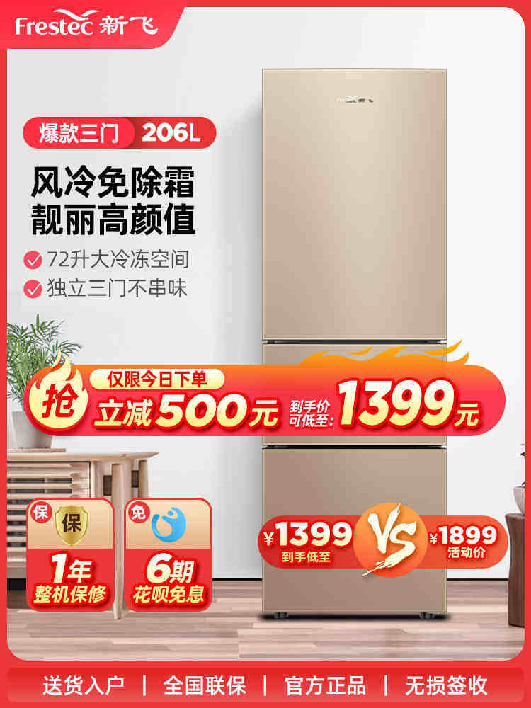 券 20元销量0新飞BCD-206风冷无霜三门冰箱小型家用节能冷藏冷冻三开门电冰箱