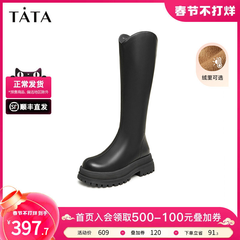 券 60元销量100Tata他她V口厚底长筒靴女英伦加绒骑士靴高筒靴2023冬新DGAA1DG3