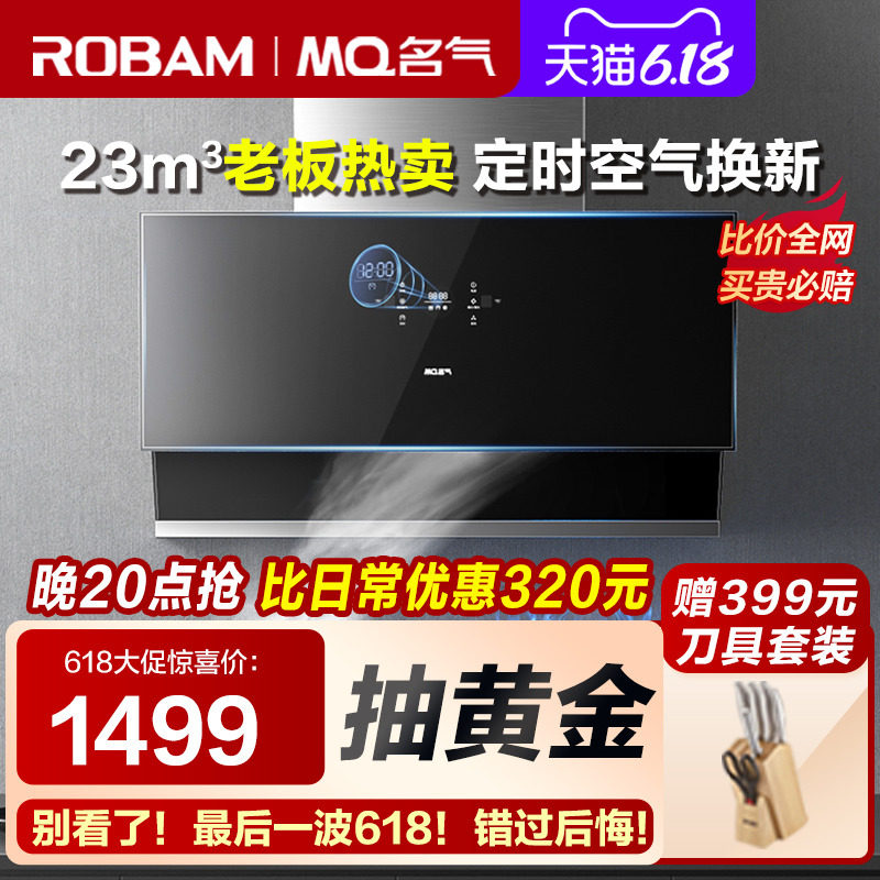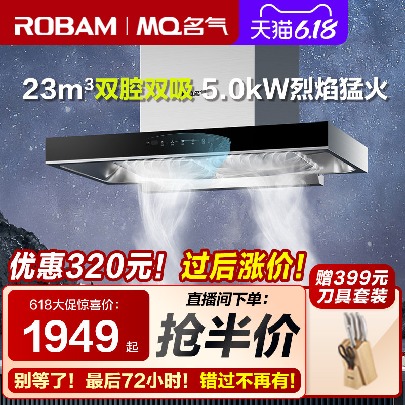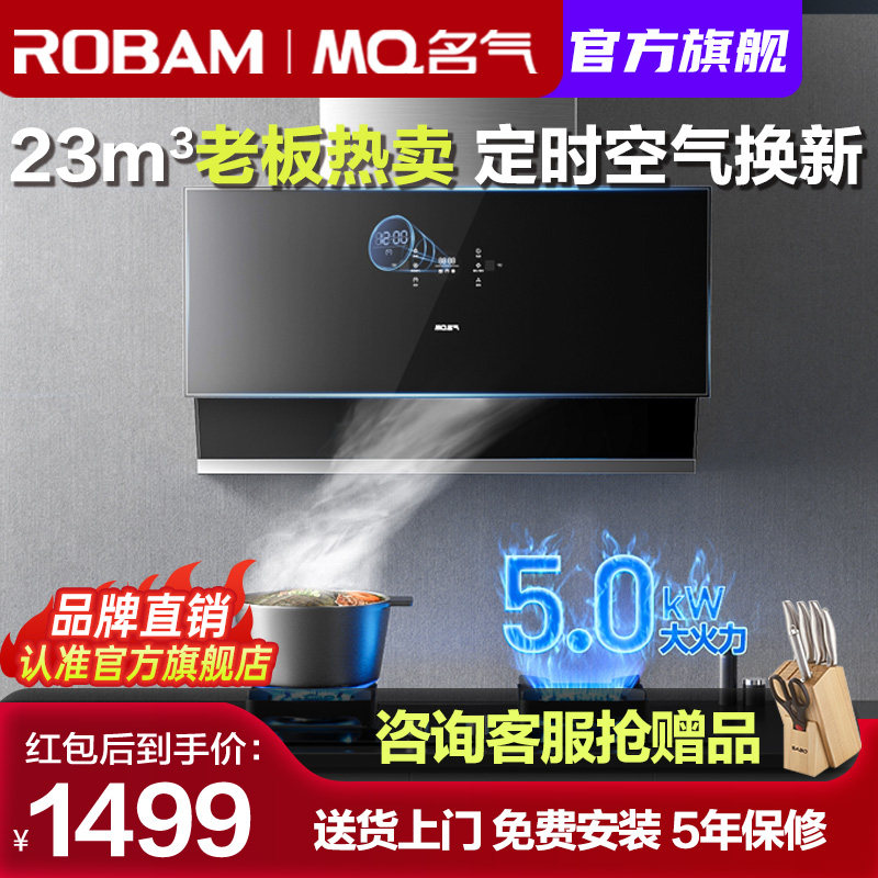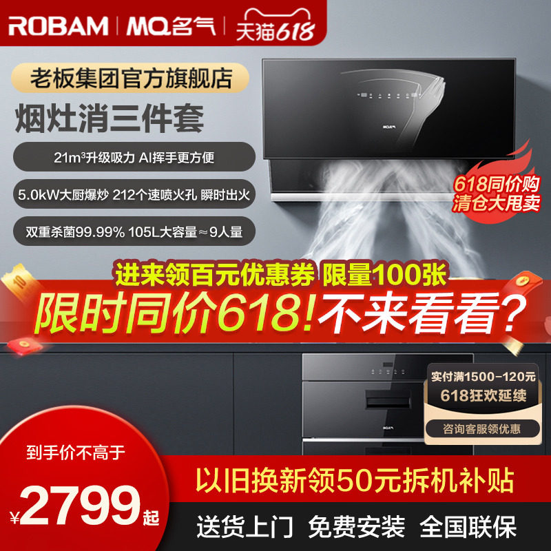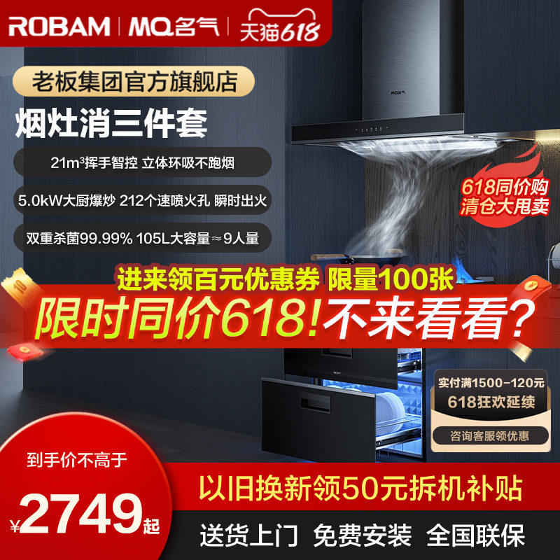 券 100元销量1000老板油烟机名气抽油烟机燃气灶套餐烟机灶具大吸力双吸吸油机6518