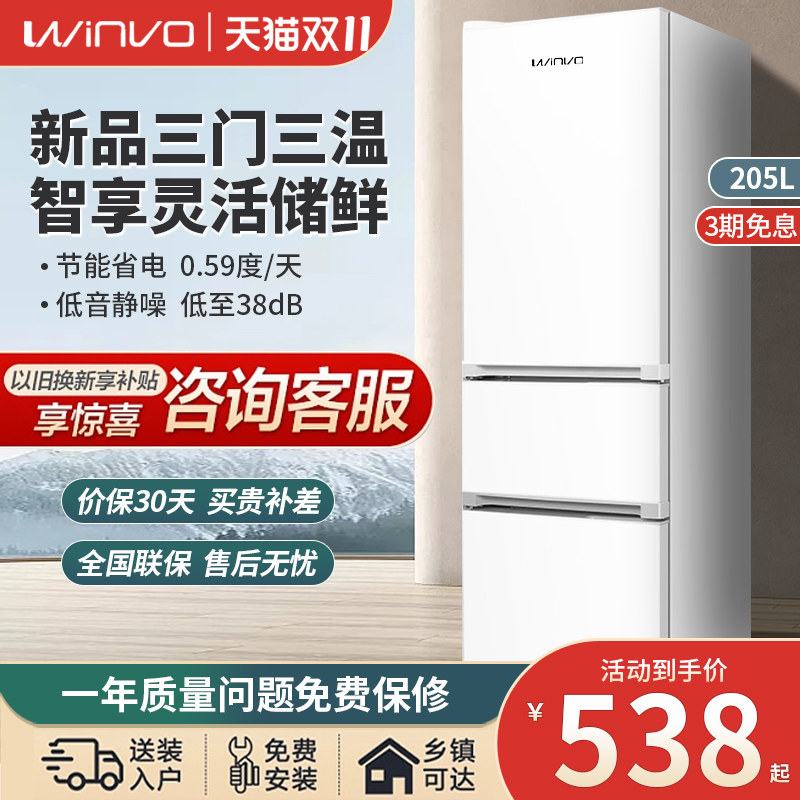 券 2元销量100新飞Winvo 205升三开门冰箱家用中型租房宿舍节能省电双门大容量