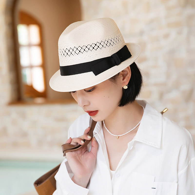 券 5元销量3爵士礼帽女夏季新款法式复古白色草帽时尚镂空草编防晒遮阳帽子女