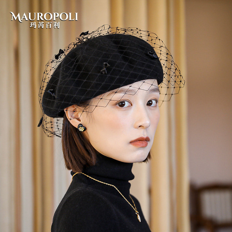 券 5元销量10法式小礼帽女黑色网纱复古羊毛毡帽新款百搭毛呢定型贝雷帽女秋冬