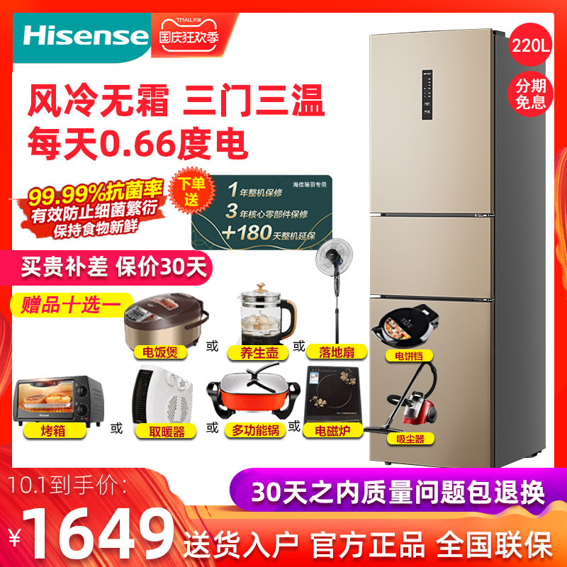 券 100元销量26海信 BCD-220WYK1DQ三门式电冰箱风冷无霜家用节能小型冷藏冻