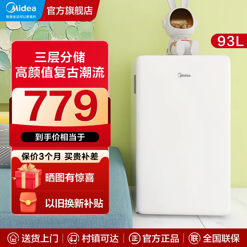 美的93L单门母婴美妆一级能效冰箱迷你小型复古冷藏节能家用省电