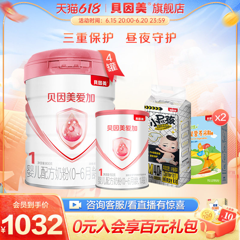 券 180元销量10【购物金享优惠】贝因美爱加婴儿配方奶粉1段800g*4罐乳铁蛋白