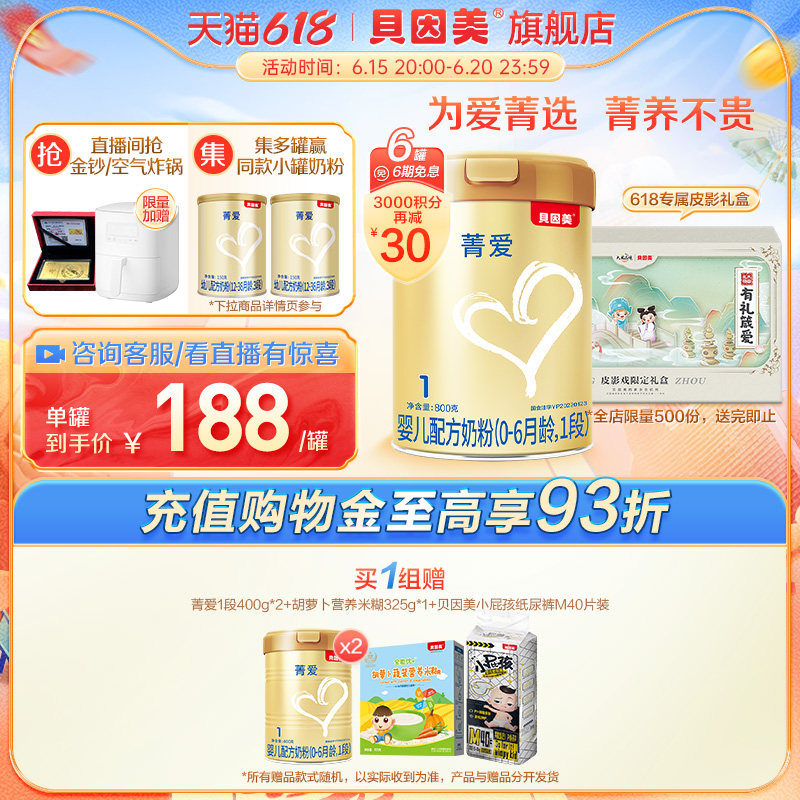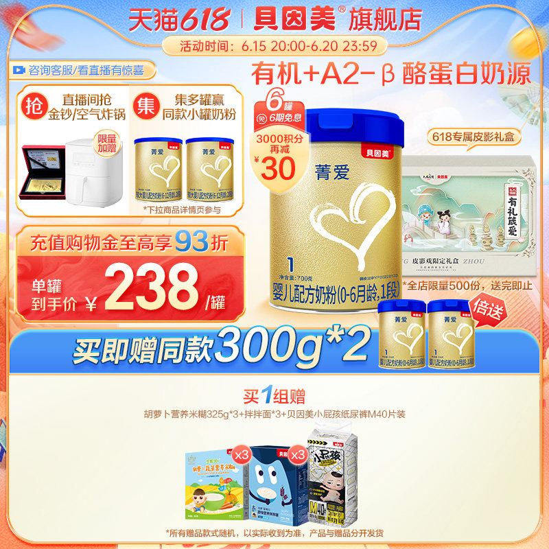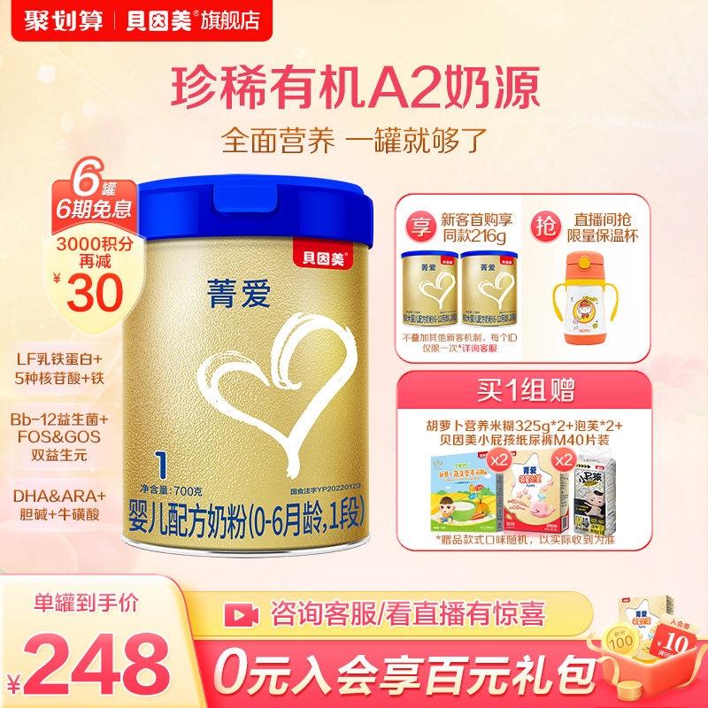 券 100元销量27【购物金93折】贝因美菁爱A2婴儿奶粉1段700g*6罐 A2有机奶源