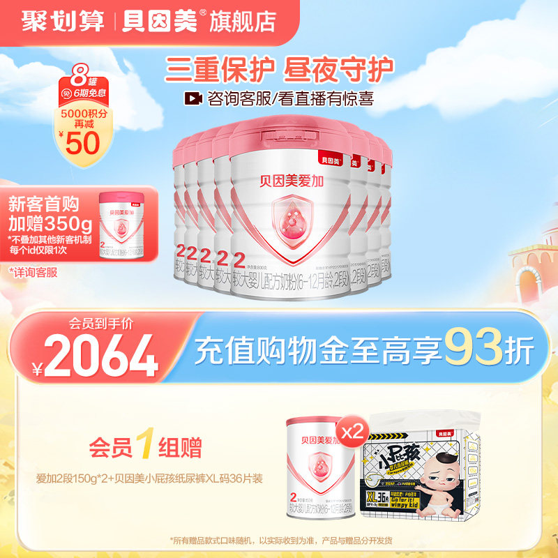 券 100元销量8【购物金93折】贝因美爱加2段婴儿奶粉乳铁蛋白奶粉800g*8罐