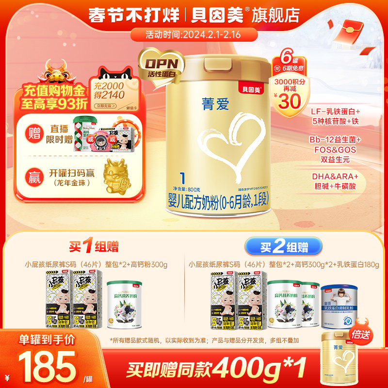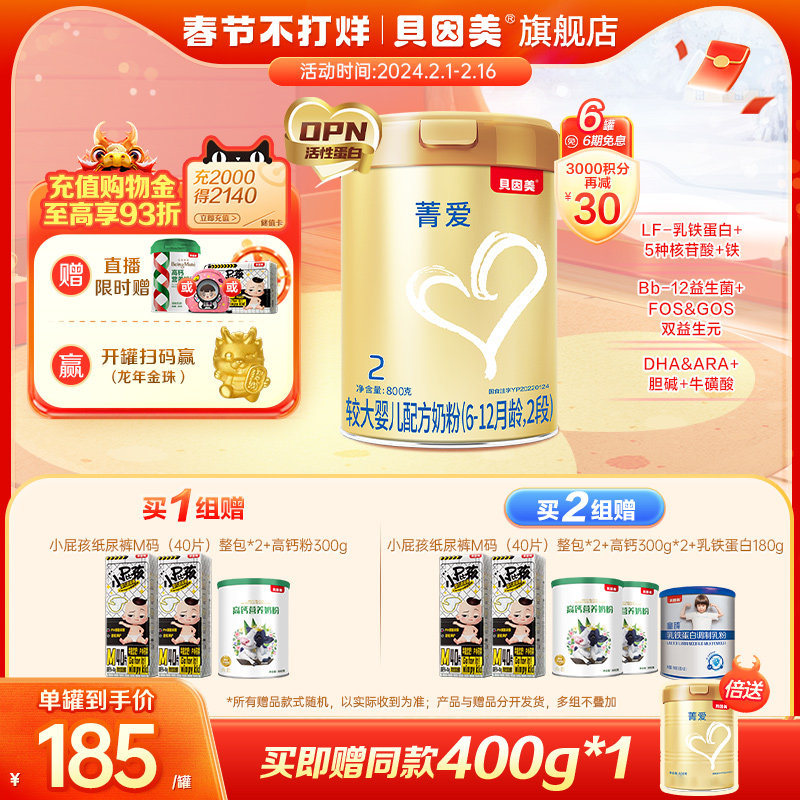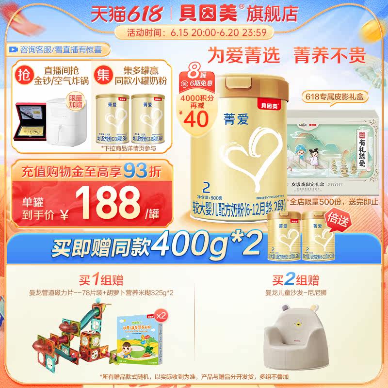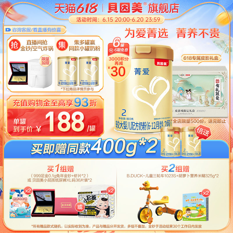 券 180元销量10【购物金93折】贝因美菁爱2段婴儿奶粉800g*8罐含乳铁蛋白
