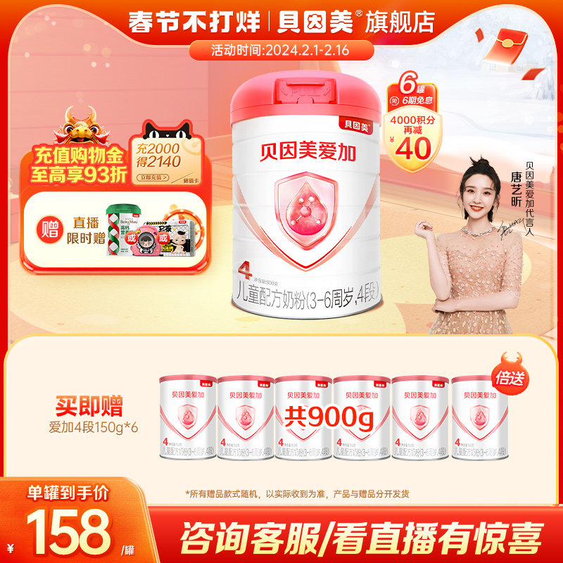 券 140元销量31【购物金93折】贝因美爱加儿童4段奶粉 成长乳铁蛋白800g*6罐