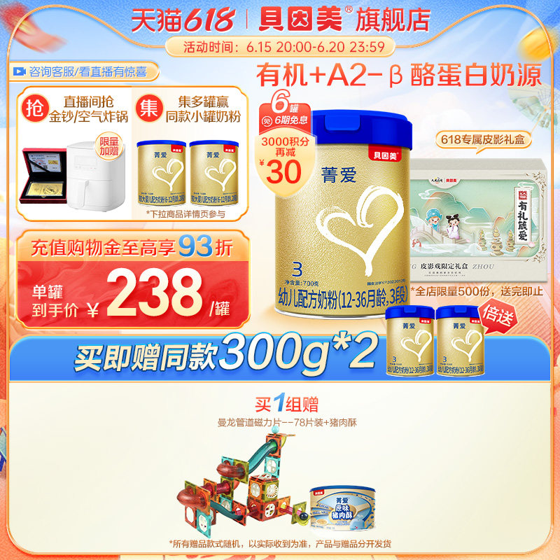 券 140元销量32【购物金93折】贝因美菁爱A2奶粉3段700g6罐 A2有机奶源
