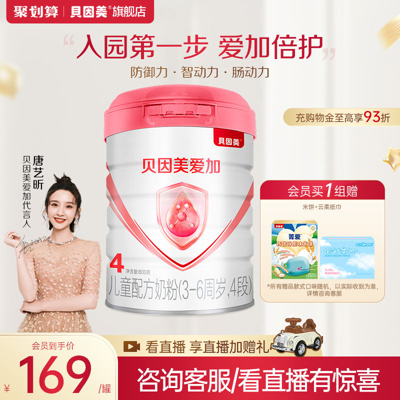 券 100元销量52【购物金93折】贝因美爱加幼儿奶粉3段1-3岁牛奶粉800g*4罐