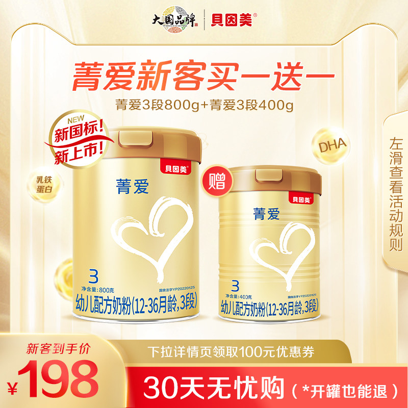券 102元销量50【新客专享】新国标 贝因美菁爱3段奶粉800g+400g 添加乳铁蛋白