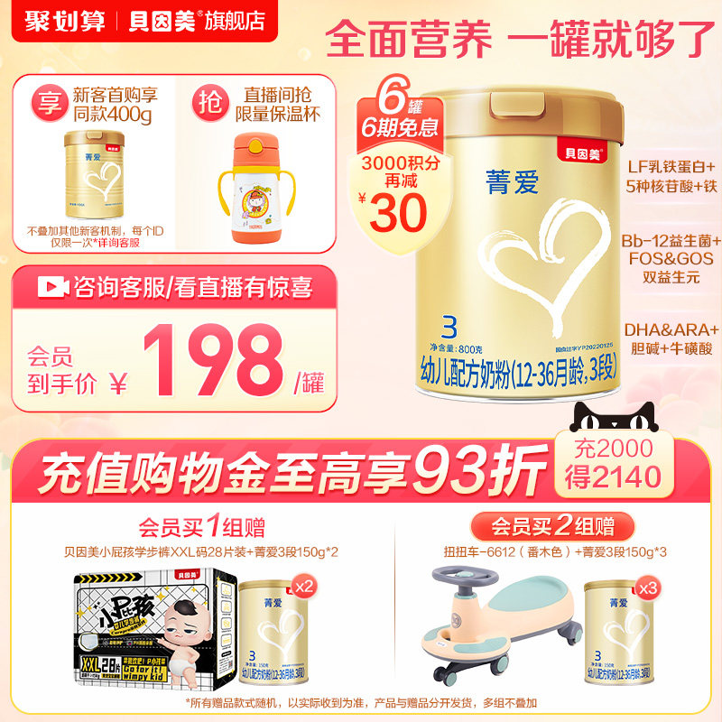 券 140元销量200【购物金93折】贝因美菁爱A2奶粉3段700g6罐 A2有机奶源