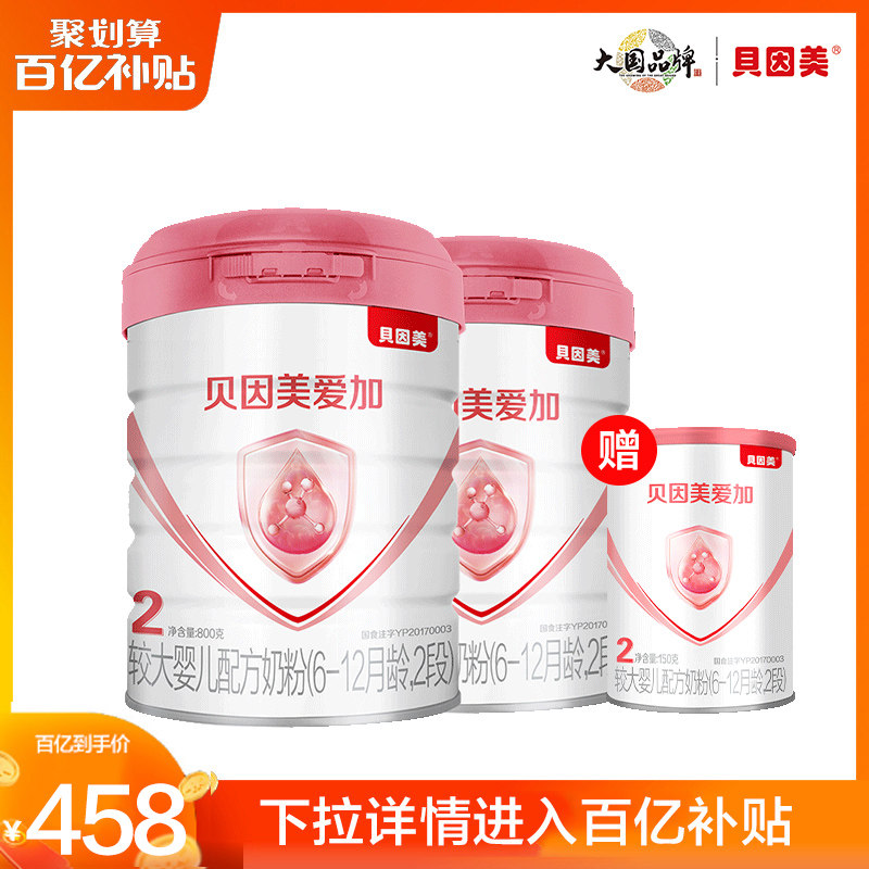 券 340元销量10【百亿补贴】贝因美爱加较大婴儿配方奶粉2段800g*2+150g乳铁蛋白