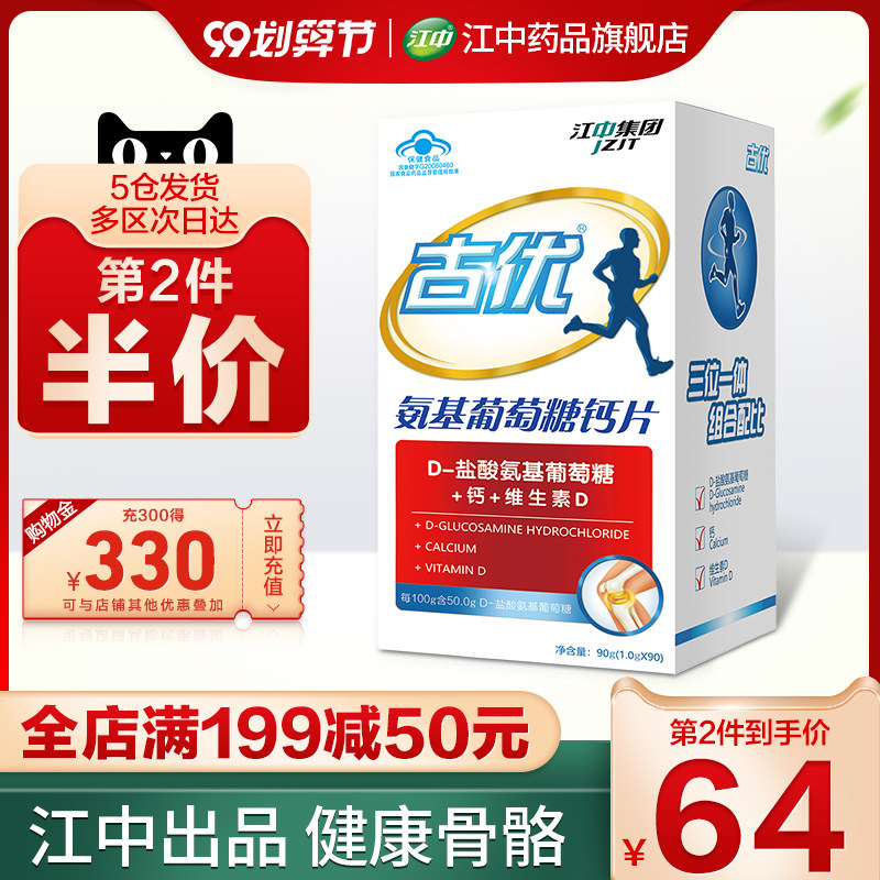 券 10元销量12第2件半价 江中氨基葡萄糖钙片90氨糖软骨素加钙关节中老年碳酸钙
