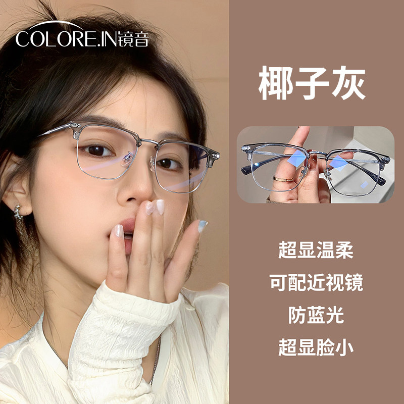 券 21元销量500半框近视眼镜框女款超轻纯钛猫耳透明椰子灰可配度数防蓝光眼睛男