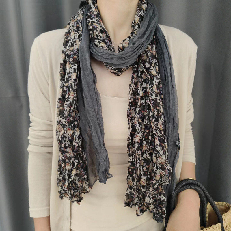 券 2元销量02023秋冬棉麻碎花围巾女百搭拼接披肩丝巾两用褶皱长款薄围脖