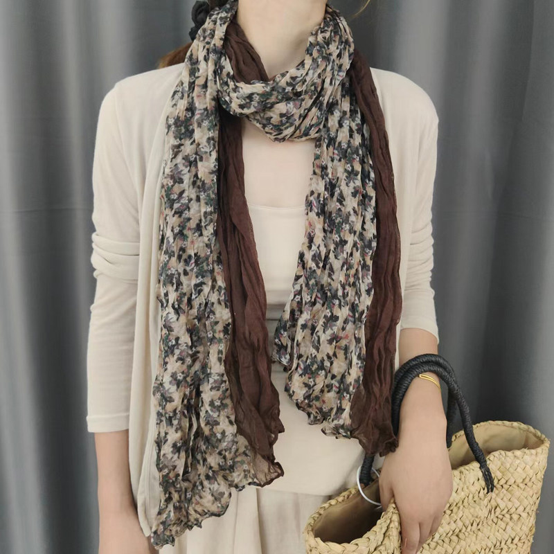 券 2元销量02023新款棉麻长款围巾女复古碎花披肩文艺褶皱薄亚麻春秋护颈围脖