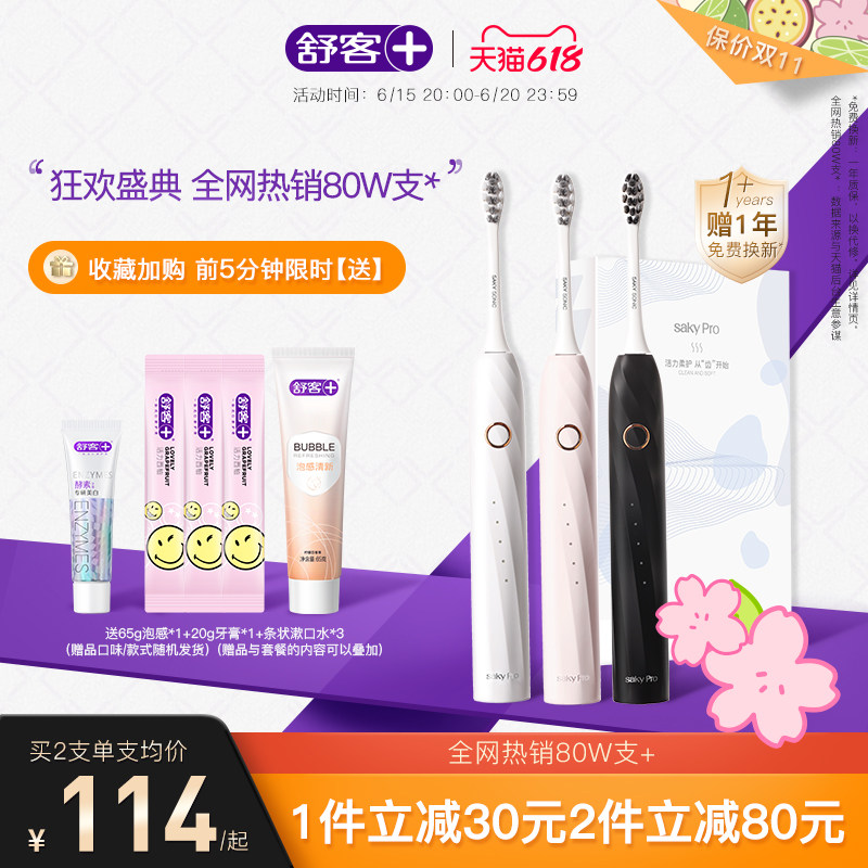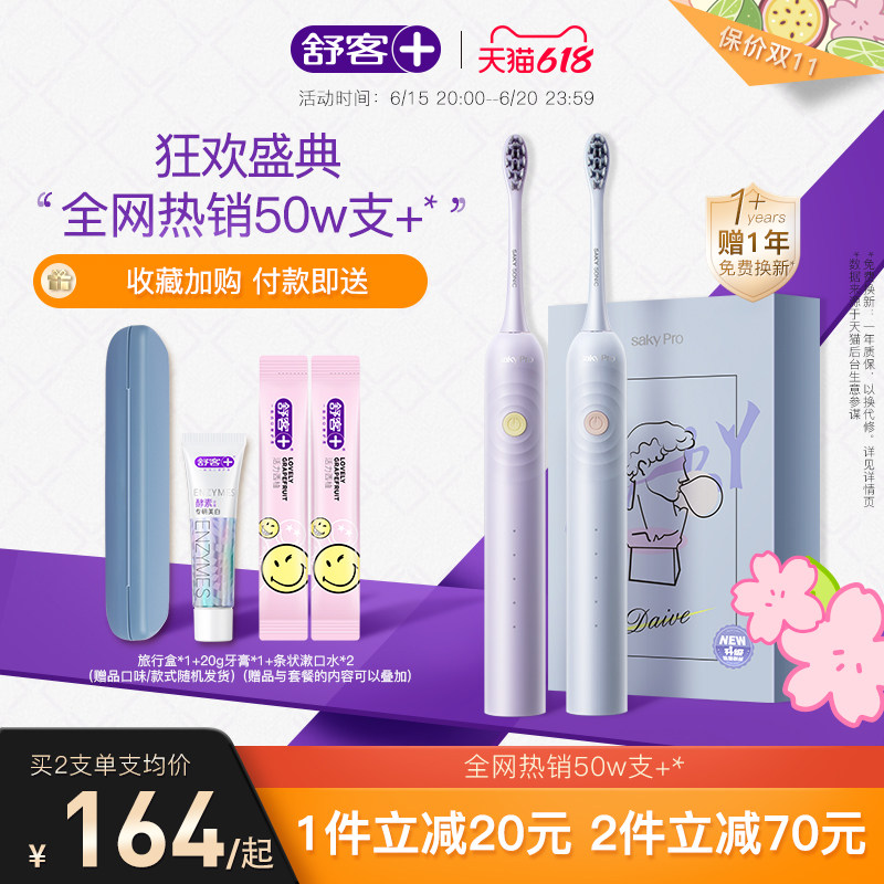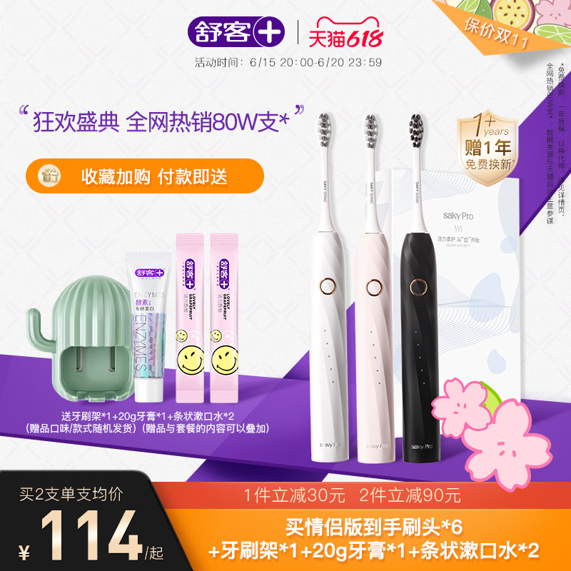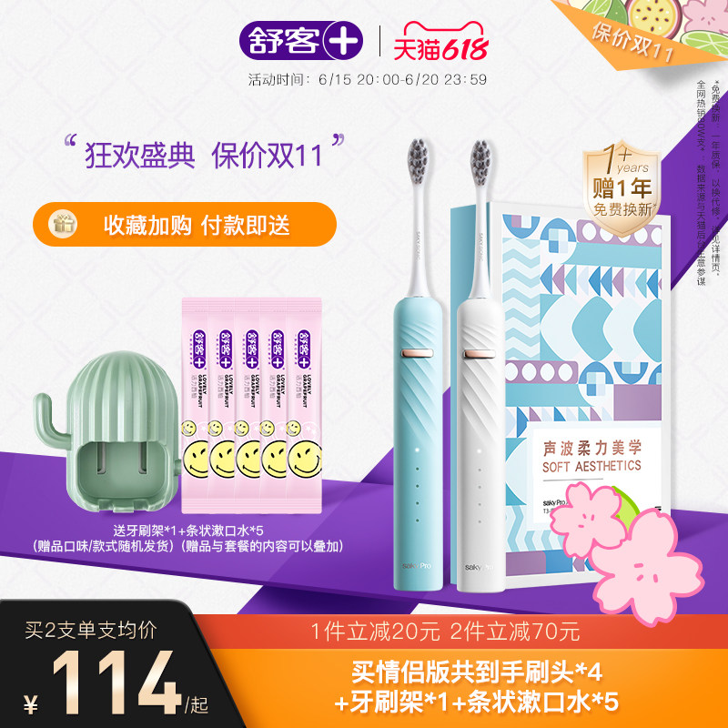 券 60元销量2000舒客电动牙刷声波成人男女情侣充电式自动学生党软毛刷套装T3