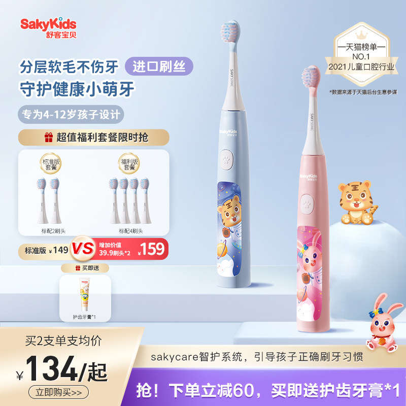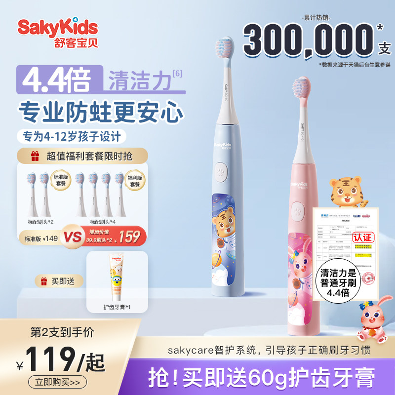 券 60元销量1000[舒客儿童电动牙刷声波智能自动小孩小学生软毛3-6-12岁B32S舒克