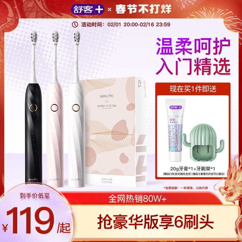 券 60元销量800舒客电动牙刷声波成人男女情侣充电自动学生软毛刷套装T3新年礼物