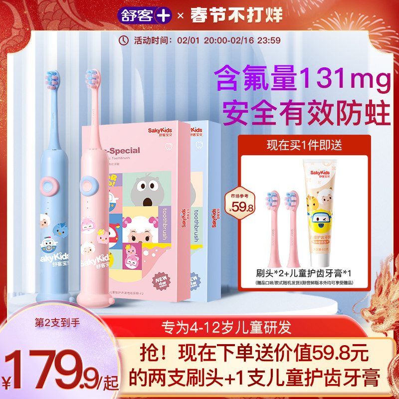 券 60元销量400[舒客儿童电动牙刷声波智能自动小孩小学生软毛3-6-12岁B32S舒克