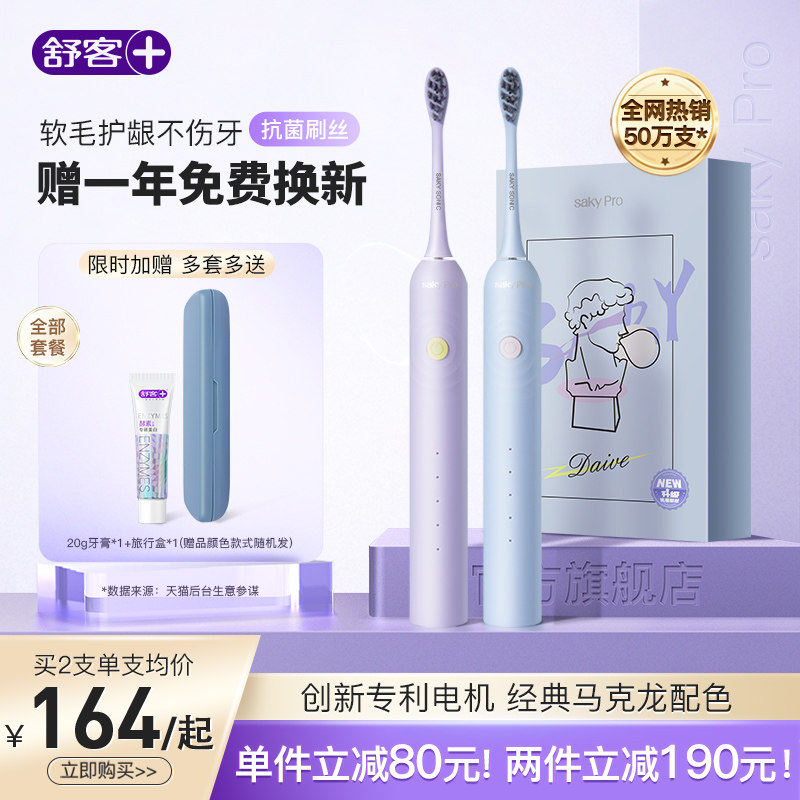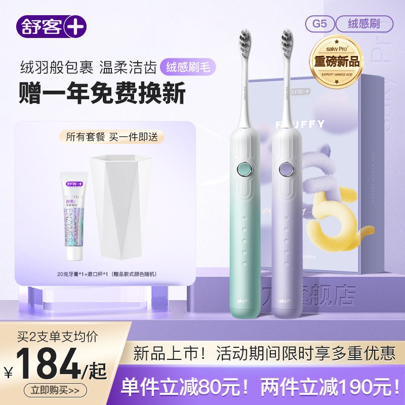 券 80元销量300舒客绒感成人电动牙刷男女情侣套装声波学生自动充电高颜值礼物G5