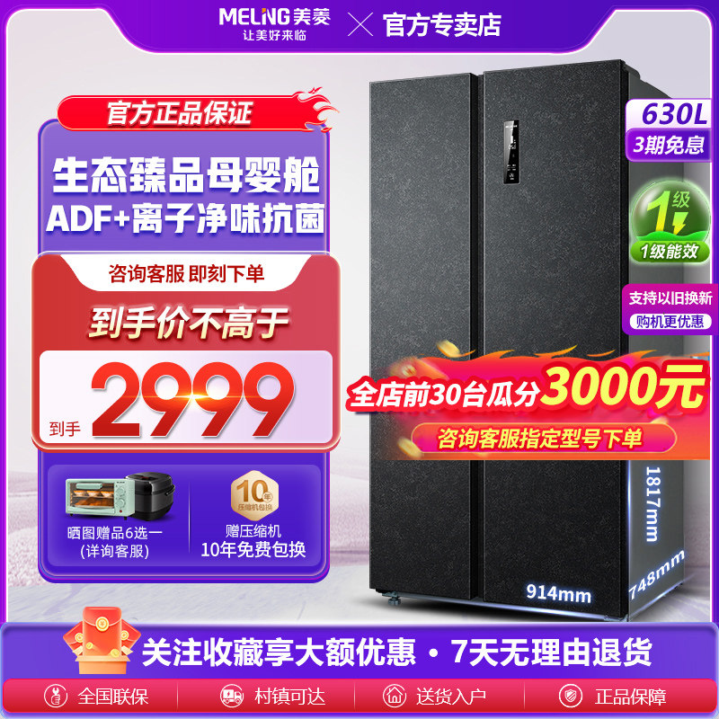 【光谱养鲜】美菱630L对开双开门一级能效母婴大容量家用电冰箱