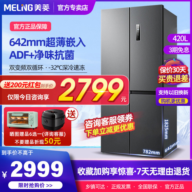 美菱420L十字对开门四门风冷无霜一级能效变频家用大容量超薄冰箱